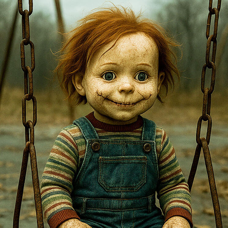 “Envision Chucky sitting on a rusted swing in an abandoned playground, his stitched grin wide and unsettling. The sky is overcast, and the wind rustles the dead leaves scattered around.”