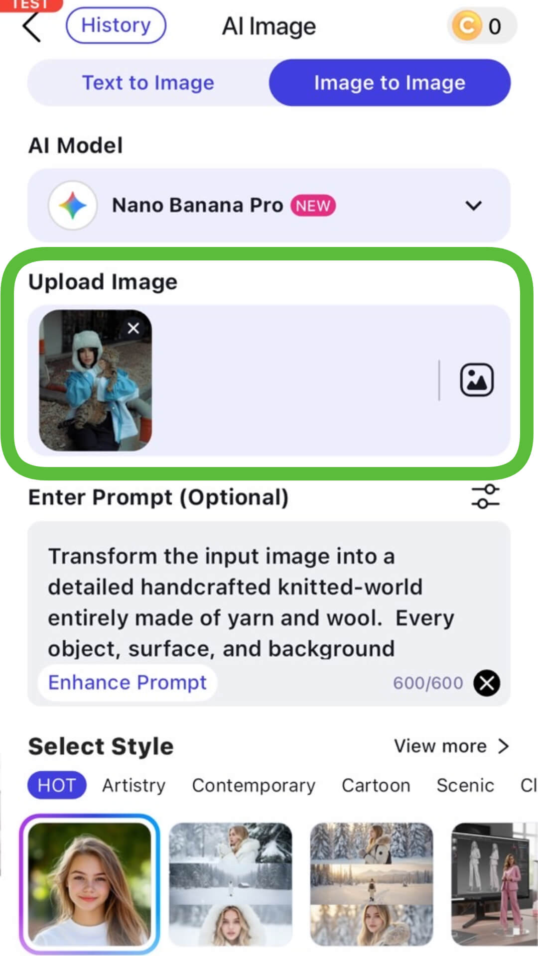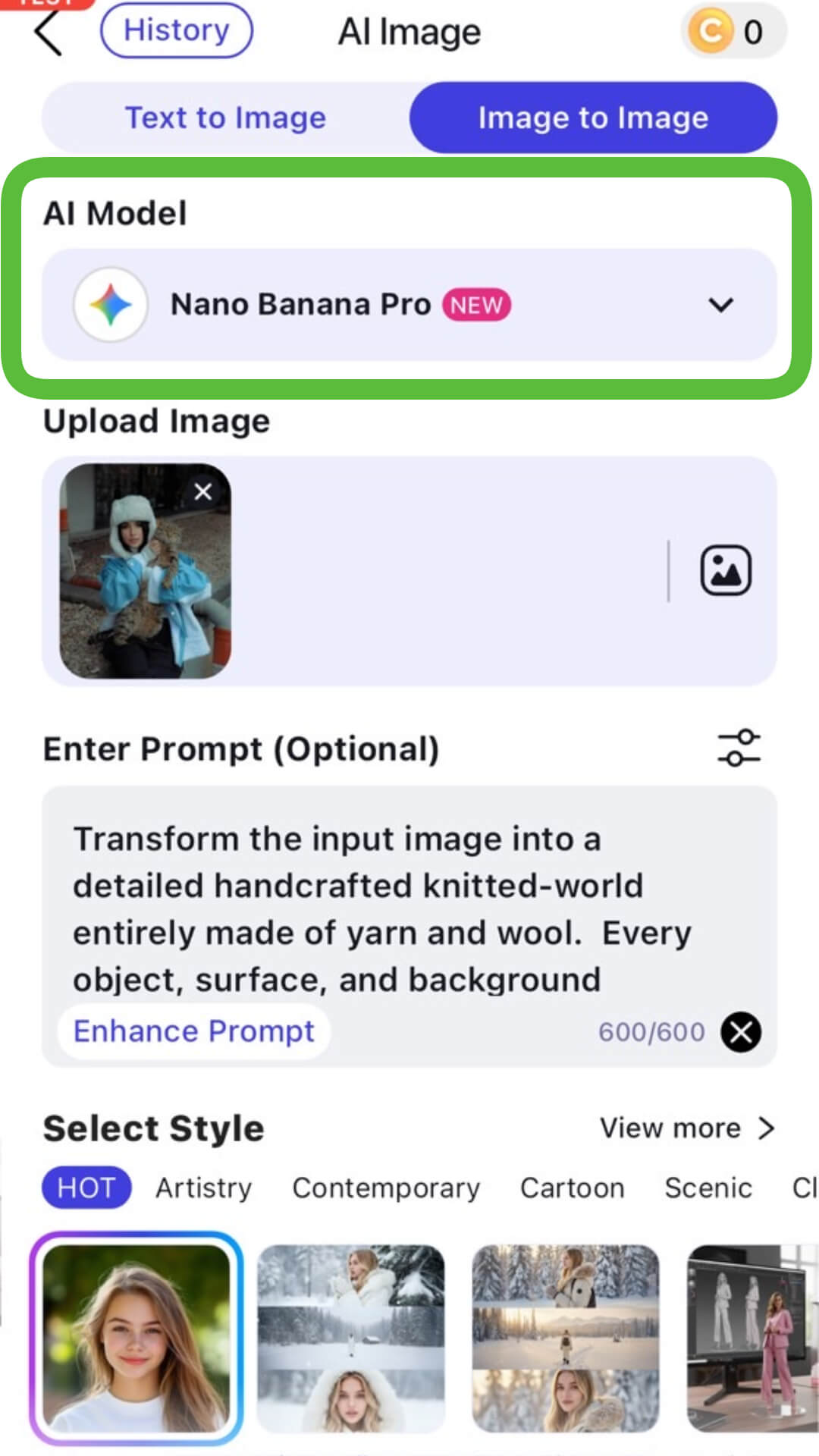Open the app. You want to look for the AI Image feature. Once there, select the Image to Image mode. This mode is crucial because it allows the AI to keep the structure of your original photo while changing the texture to yarn.
