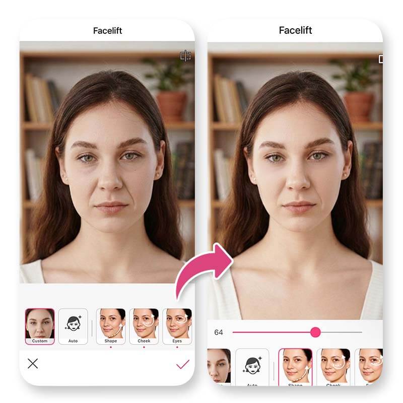 The AI Facelift and Face Reshape tools in YouCam Makeup help refine your facial structure by adjusting your jawline, cheekbones, chin, and even face width. It also helps create a more lifted and youthful appearance, perfect for reclaiming youth and feeling young again!