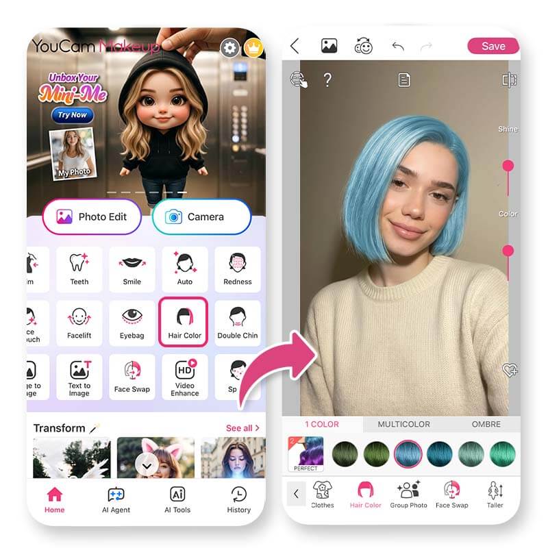With the Hairstyle and Hair Color tools in YouCam Makeup, you can preview different looks instantly. You can try: