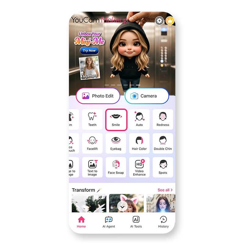 Tools like Smile and Teeth in YouCam Makeup help improve your smile in photos. Features include: