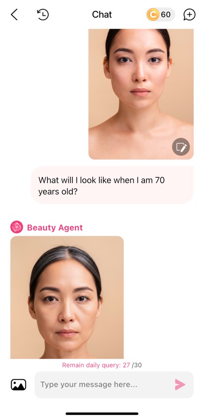 Simply open YouCam Makeup, tap Beauty Agent, upload your photo, and enter a prompt like “make me look 40 years older.” The app will generate a lifelike older version of you in seconds. You can then fine-tune the details or even animate it into a video.