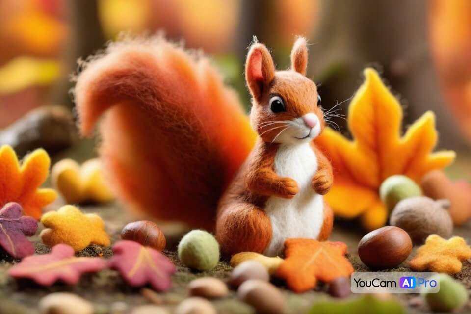 ▲ Prompt: "Ein Eichhörnchen sammelt Nüsse auf dem Waldboden, umgeben von bunten Herbstblättern." | Stil: Nadelfilz