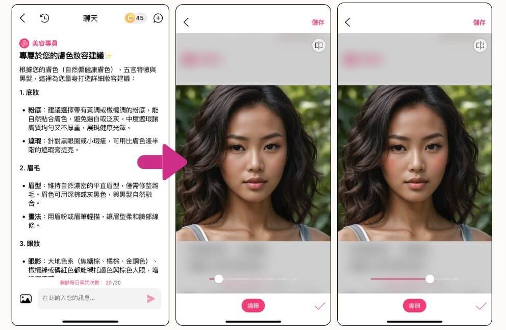 更特別的是, 精準的「個人色彩分析」功能能根據你的膚色底調、髮色與五官對比,自動判定你的色彩鑑定及五官分析,並推薦適合的彩妝與髮色組合,讓整體造型更協調自然。