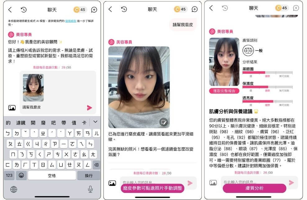 「美容專員」是一位結合 AI 與對話式體驗的美妝顧問,能夠依照你的自拍照,提供從膚質分析、妝容推薦、髮型建議到穿搭模擬的全方位服務。你只需要上傳一張照片,AI 就能自動偵測膚色、膚質與臉型,並根據結果提供個人化建議。