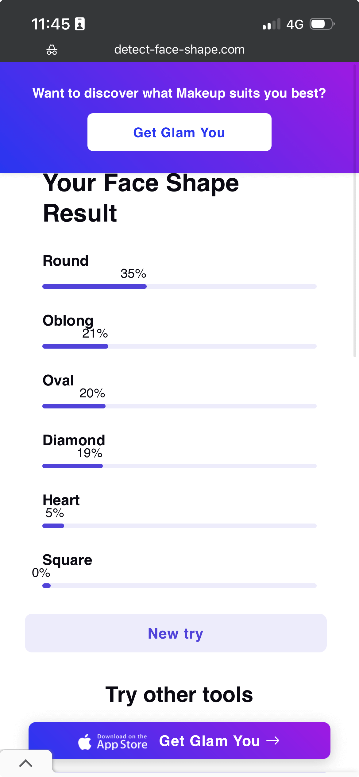 - Results: Its face shape detector provides a detailed breakdown of your facial structure, showing how much you align with different shapes through specific percentages. For instance, my results showed a mix of five shapes—48% Oval, 34% Round, and 11% Oblong—accompanied by a concise, one-sentence makeup tip tailored to these findings.