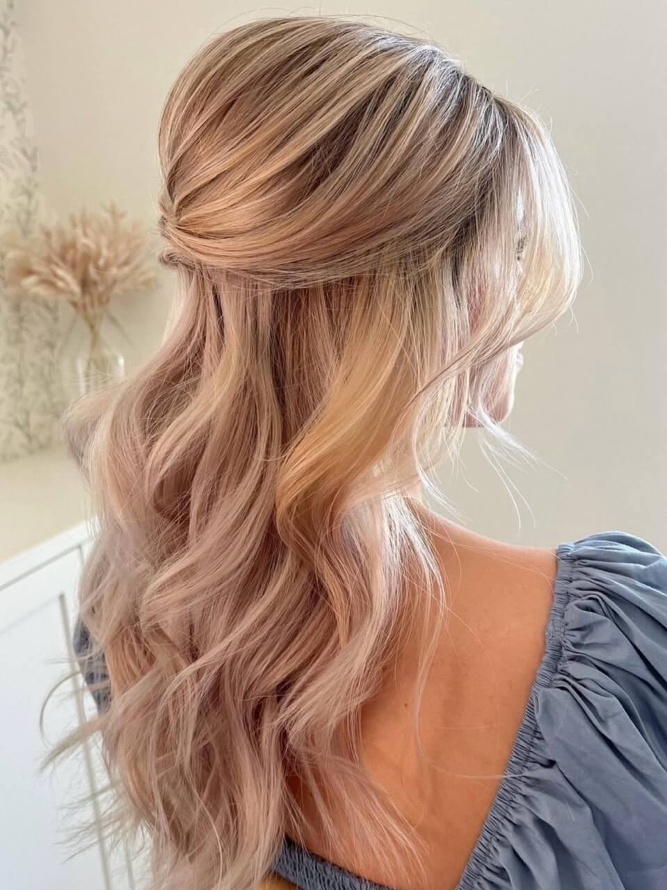 Effortlessly chic and feminine, the wavy half up half down hairstyle offers a perfect balance of elegance and allure. This versatile look makes it a great choice for anyone seeking a romantic yet modern look.