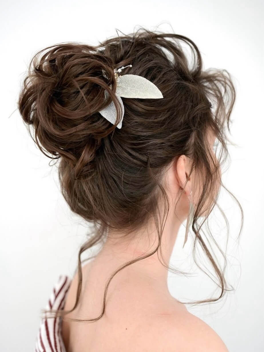 The high messy bun offers a playful and carefree look that's perfect for prom night. This tousled hairstyle adds volume and texture to your hair, creating a youthful and vibrant vibe that's sure to turn heads on the dance floor.