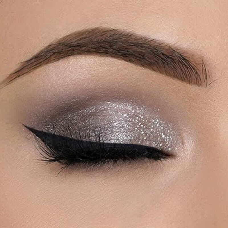 For a winter wonderland vibe, try a frosted silver eye look. This style uses soft, icy silver shades swept across the lid, with a touch of highlighter on the inner corners to give an extra frosty effect.