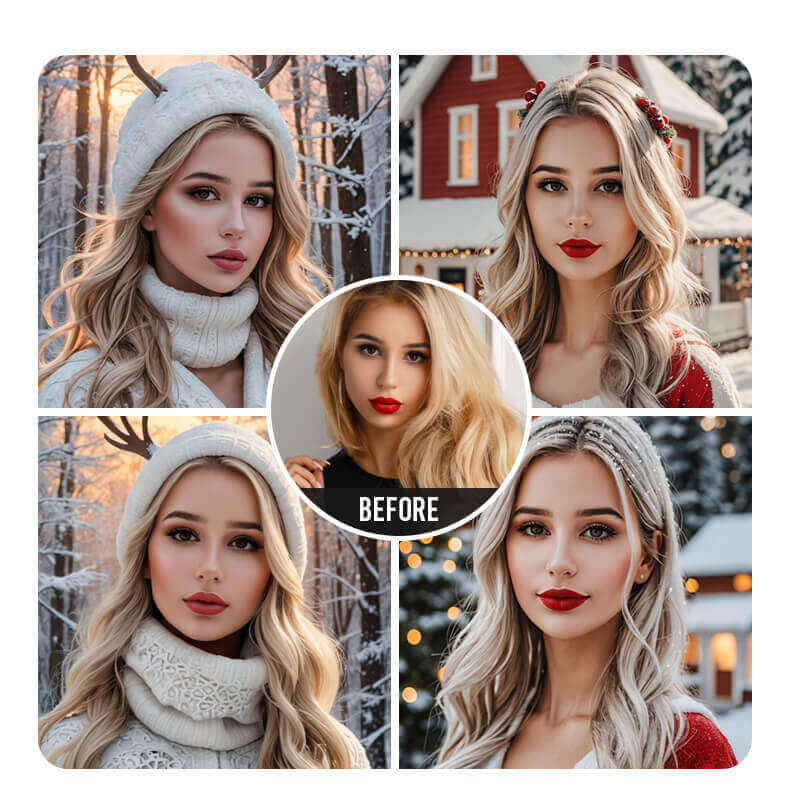 You’ll see more people using deep, festive colors like emerald green, ruby red, and sapphire blue, along with shiny silver and chrome accents to make their photos sparkle. At the same time, changing to a simple and natural background — such as snowy forests, cozy wood textures, or soft dried flowers — are becoming popular for a calm, classic look. On the tech side, more users are using AI tools to swap faces, create fun group photos, and make vertical edits that look great on Instagram or TikTok.