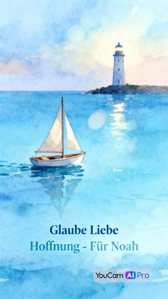 • "Ein kleines Segelboot auf ruhigem blauen Wasser, ein Leuchtturm im Hintergrund, mit dem Text 'Glaube Liebe Hoffnung - Für Noah', maritimer Illustrationsstil, sanfte Blautöne"