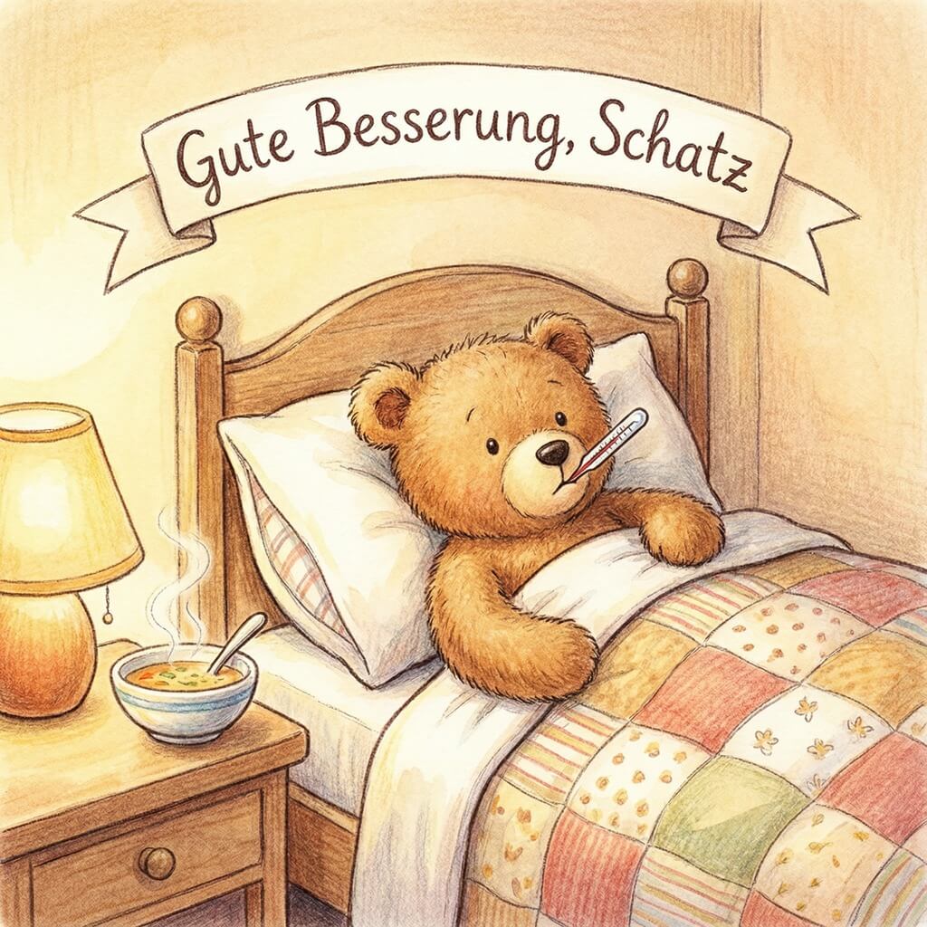 • "Ein flauschiger Teddybär im Bett zugedeckt, Thermometer im Mund, eine Schale Suppe daneben, mit dem Text 'Gute Besserung, Schatz', süßer Illustrationsstil, warmes Licht"