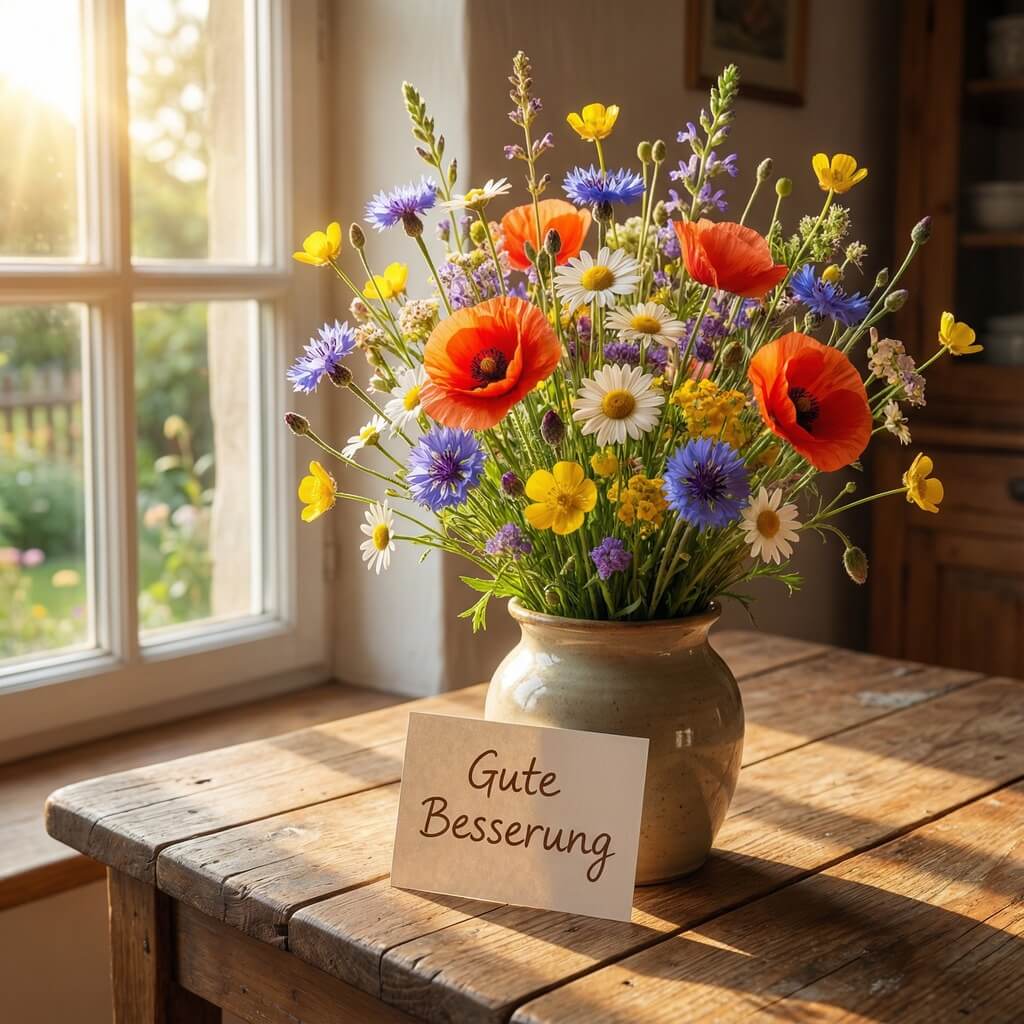 • "Ein wunderschöner Strauß bunter Wiesenblumen in einer Vase auf einem sonnigen Holztisch am Fenster, warmes Morgenlicht, mit dem Text 'Gute Besserung', fotorealistischer Stil, hohe Qualität"