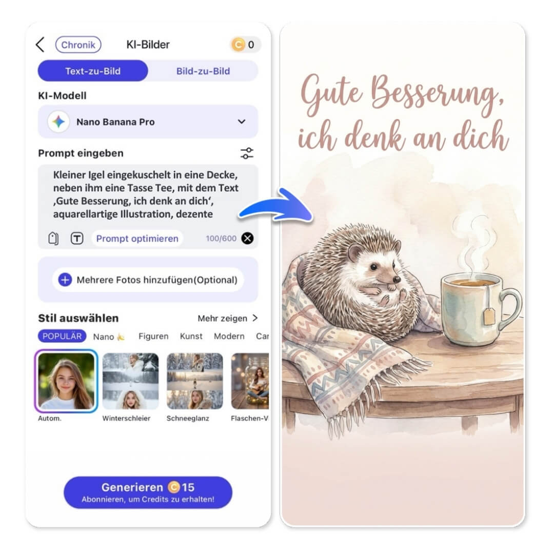 Ja, das ist der große Vorteil von KI-Modellen wie Nano Banana Pro in YouCam AI Pro. Schreibe einfach in deinen Prompt: mit dem Text "Gute Besserung, Thomas", und die KI integriert den Namen direkt in das Bilddesign.