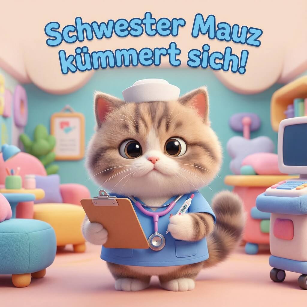 • "Eine niedliche Katze verkleidet als Krankenschwester mit kleiner Haube und Stethoskop, schaut ernst aber süß, mit dem Text 'Schwester Mauz kümmert sich!', Pixar 3D-Stil, lustig"