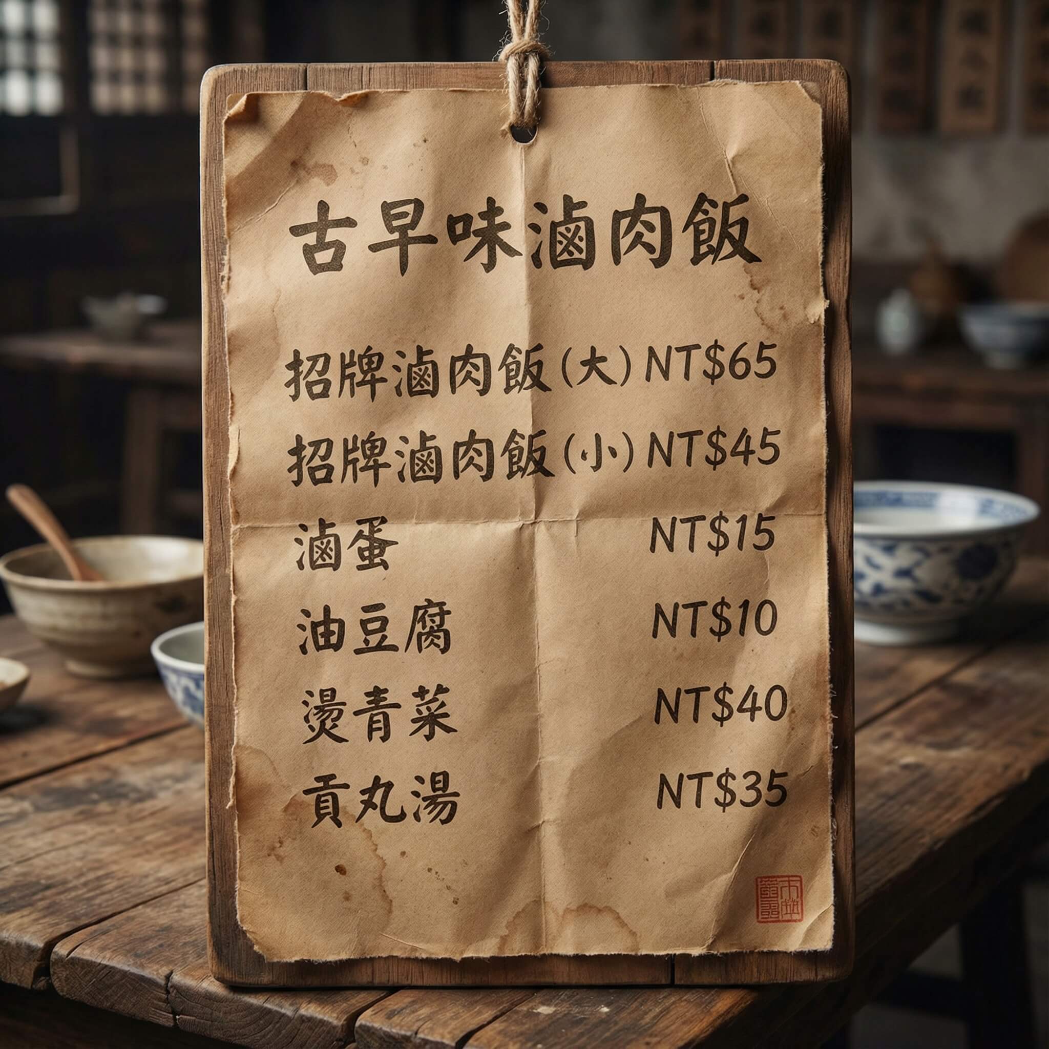 | 請幫我生成一家滷肉飯的中文菜單,並標上各台幣價錢,字體以古早味的風格,菜單是棕色的牛皮紙。 |