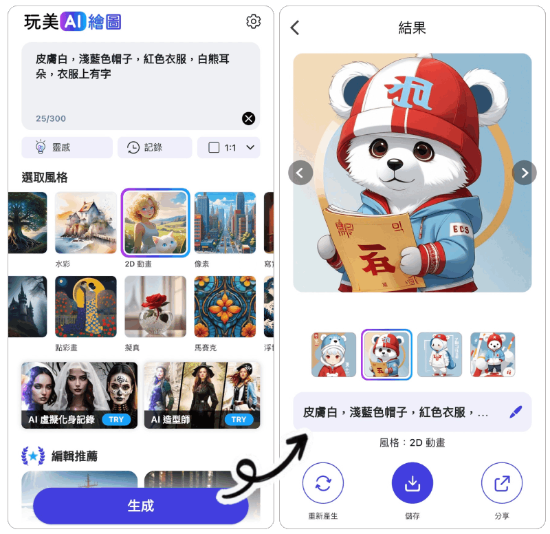 如果你想微調圖片生成結果,也可以直接在指令欄位修改,或重新挑選風格跟圖片尺寸。