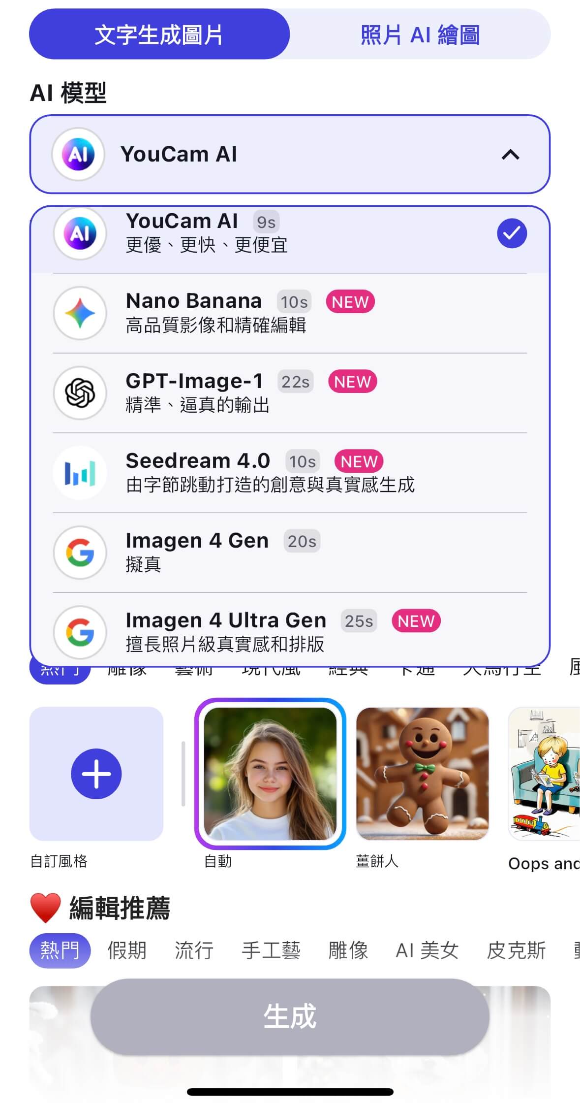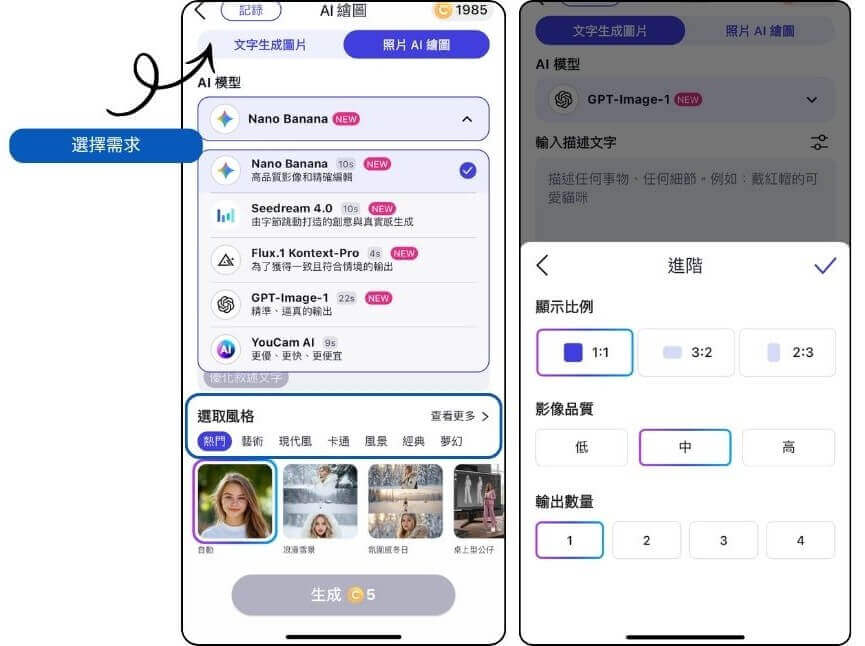 ▲ 「玩美 AI 繪圖」目前已整合 Nano Banana、ChatGPT、Flux、Imagen 等全球主流的 AI 生成圖片模型,讓使用者在同一款 App 中即可體驗多種不同風格的生圖效果。