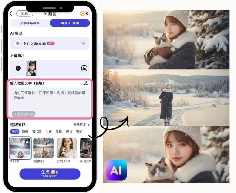 打開 App 後,你會看到 AI 指令輸入的地方,並且你可以添加參考照片、選擇預設關鍵字補強咒語、選擇 AI 繪圖風格、選擇生成圖片尺寸,最後開始生成。