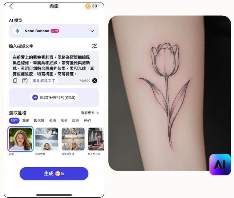 ▲ 在前臂上的鬱金香刺青。風格為極簡細線風,黑色線條、筆觸柔和細緻,帶有優雅與清新感。呈現自然貼合肌膚的效果,柔和光線、真實皮膚質感,特寫構圖,高解析度。(模型:Nano Banana , 風格:擬真)