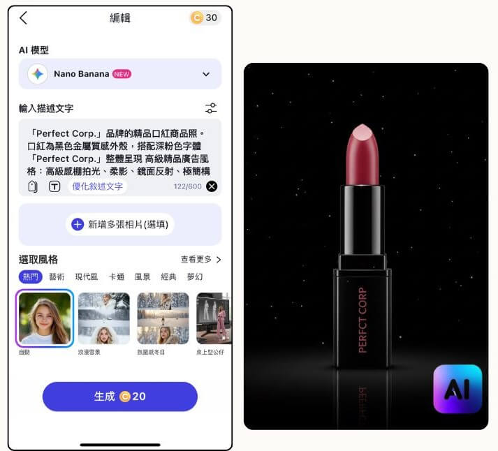 ▲ 「Perfect Corp.」品牌的精品口紅商品照。口紅為黑色金屬質感外殼,搭配深粉色字體,整體呈現 Chanel 廣告風格:高級感棚拍光、柔影、鏡面反射、極簡構圖、黑色背景帶微亮光點,質感精緻、時尚、高奢,超高清、寫實。(模型:Nano Banana , 風格:擬真)