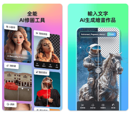 除了基本的裁切、調色與濾鏡外,還整合 AI 技術,能夠自動去背景、換天空、修復模糊照片,也支援 AI 生成圖片。 介面簡單、快速上手,適合想要在手機上完成高品質照片編修的使用者。