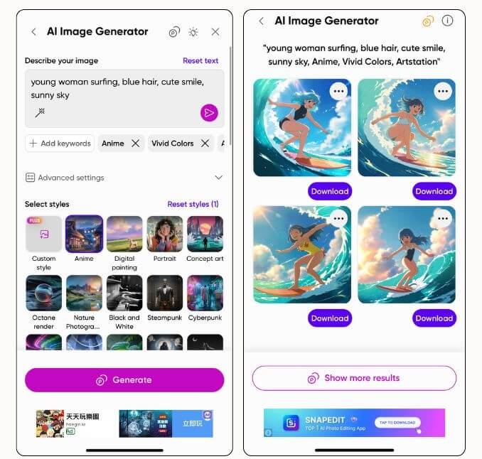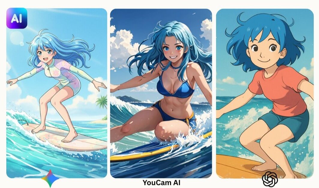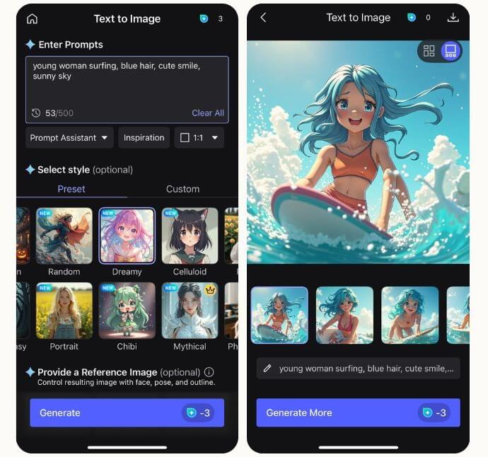 ▲ 實際測試在【 玩美 AI 繪圖 】內目前使用率最高的主流繪圖模型,我們嘗試了用「年輕女子衝浪,藍色頭髮,可愛微笑,陽光明媚」的中文繪圖指令,並搭配 App 內的動畫或卡通藝術風格進行文字轉影像功能測試,一起看看測試結果吧!