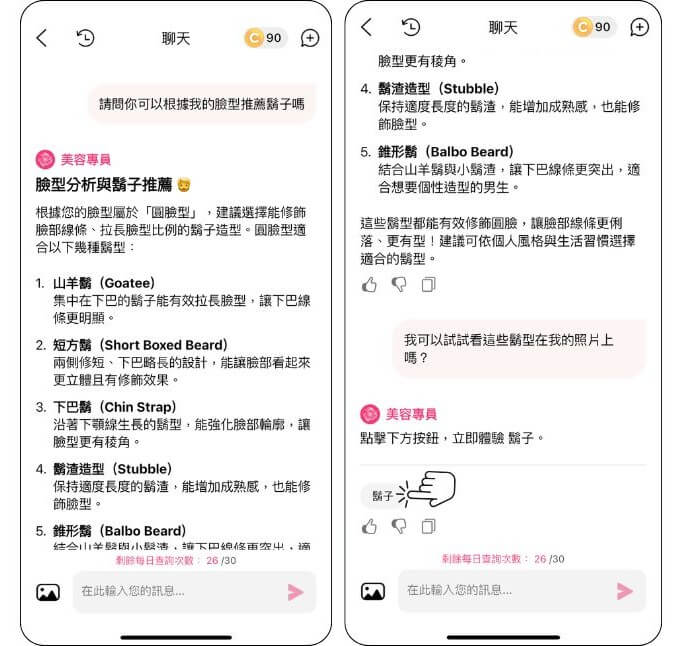 除了用玩美彩妝內建的男生髮型一鍵試髮外,現在還能體驗全新升級的 「美容專員」對話式修圖助理! 這是一款能根據你的臉型特徵與風格需求,即時推薦髮型、鬍型與五官修飾建議的 AI 專員。 只要透過聊天互動,就能快速得到個人化的修圖與造型建議,無論是拍證件照、形象照或社群大頭貼,都能在幾秒內完成自然又專業的修飾效果。