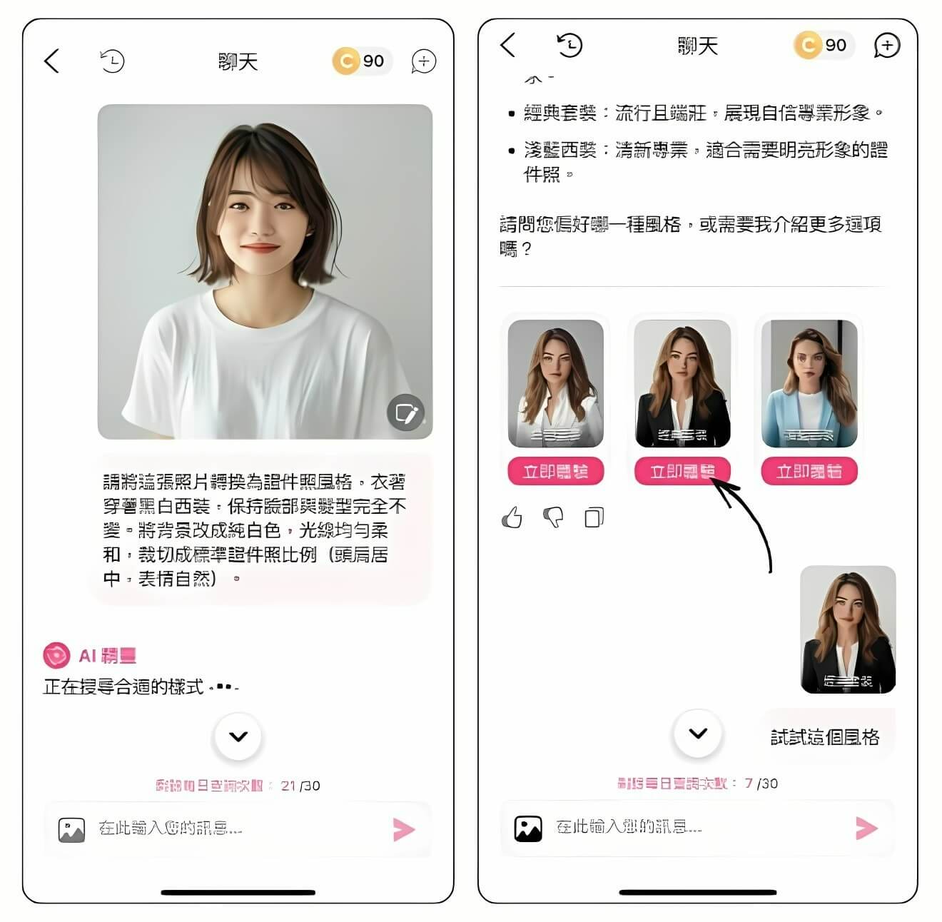 - 步驟一:開啟 玩美彩妝「對話式美容專員」,由 AI 一鍵完成修圖、妝髮微調與服裝模板套用。