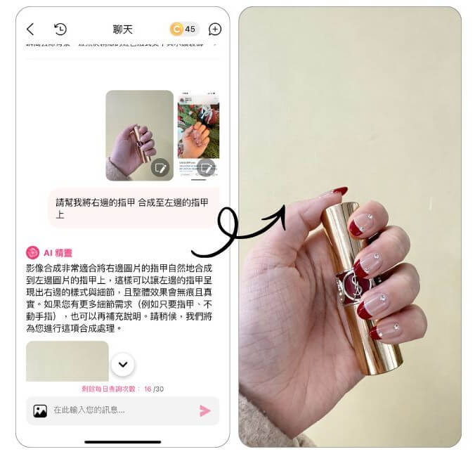 ▲ 生成指令:我想要將第二張圖片的指甲在不改變第一張圖片上,精準還原合成至第一張圖的指甲上
