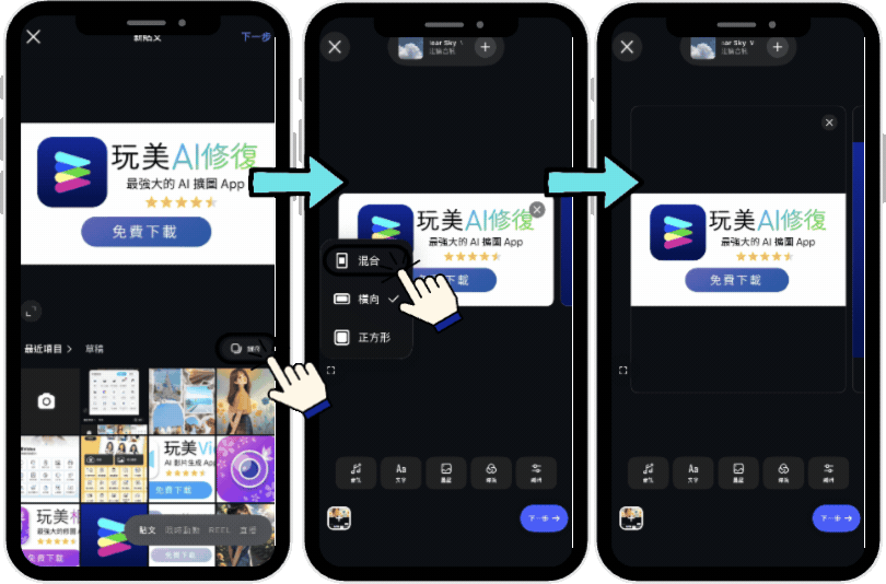 可以,IG 在 2026 年已經開放同一篇貼文中放入不同尺寸的照片了!選擇多張照片後,調整成「混合」格式即可。若想讓貼文照片更有一致性,建議可使用玩美 AI 修復將照片尺寸變相同比例。