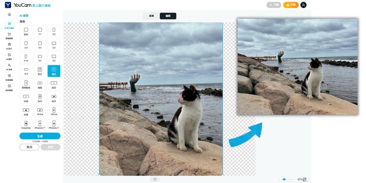 想要使用跟玩美 AI 修復同樣效果的 AI 擴圖功能,進入 YouCam 線上圖片編輯網站後,點選 「AI 照片編輯」分類中的 「AI 擴圖」,上傳照片、選擇尺寸後並點選生成,即可等待完成擴圖。