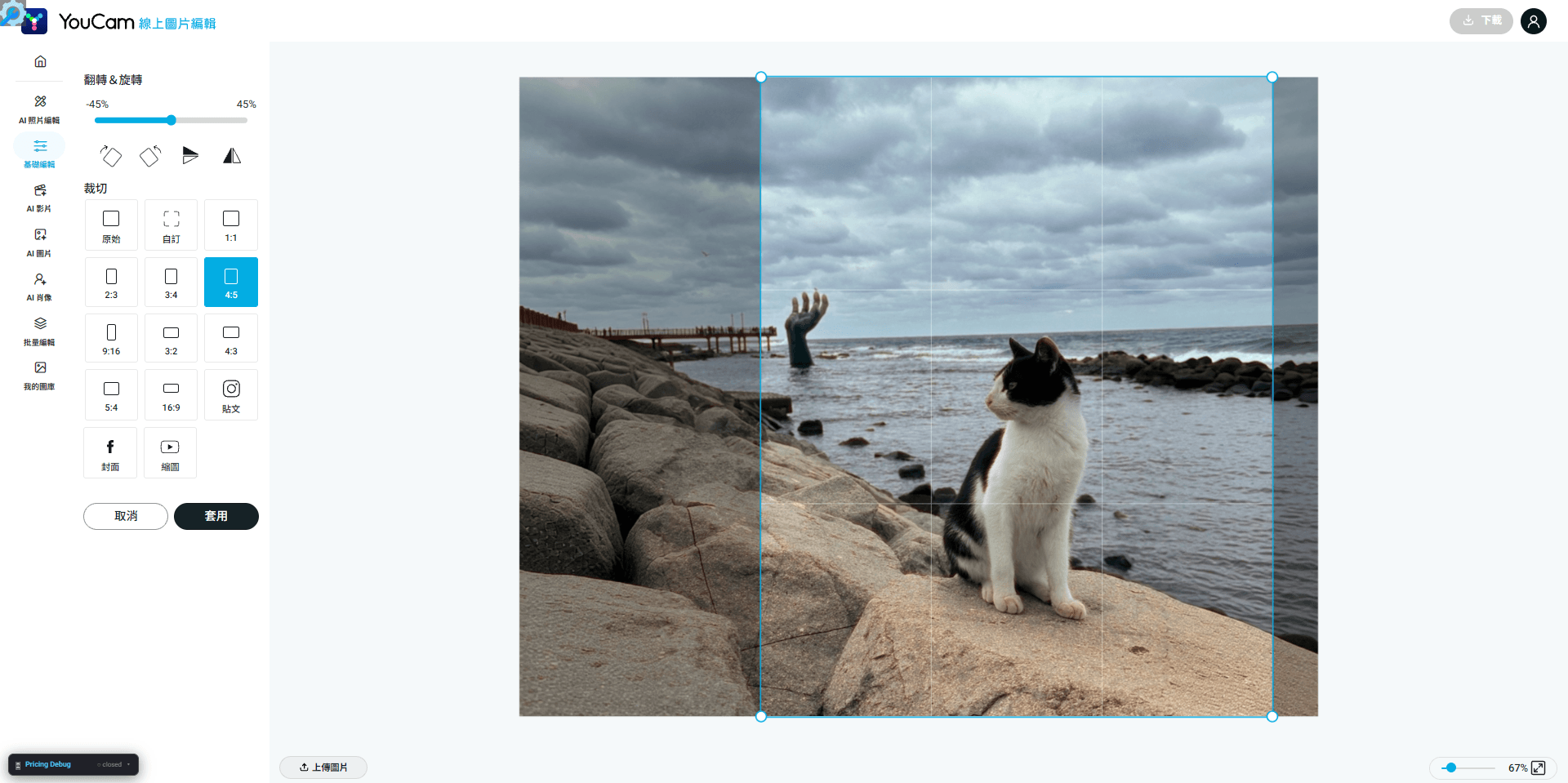 點選「基礎編輯」分類中的「裁切」功能,上傳照片後即可直接為圖片進行尺寸裁切,也可翻轉、旋轉角度。
