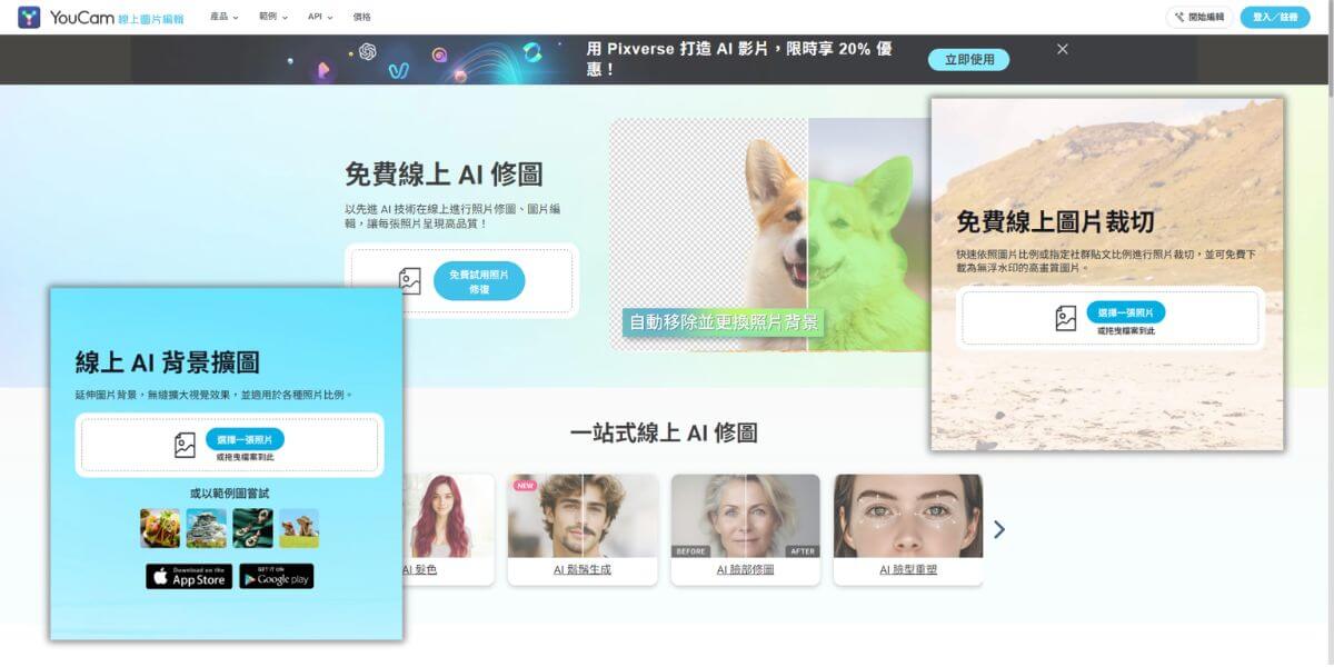 YouCam 線上圖片編輯提供各式各樣的基礎編輯、AI 生成功能,其中包含前文介紹的 2 種功能:AI 擴圖、照片裁切,都適合用來線上調整圖片尺寸。還可進一步為圖片修圖、調色、套用濾鏡或是批量提升照片畫質。