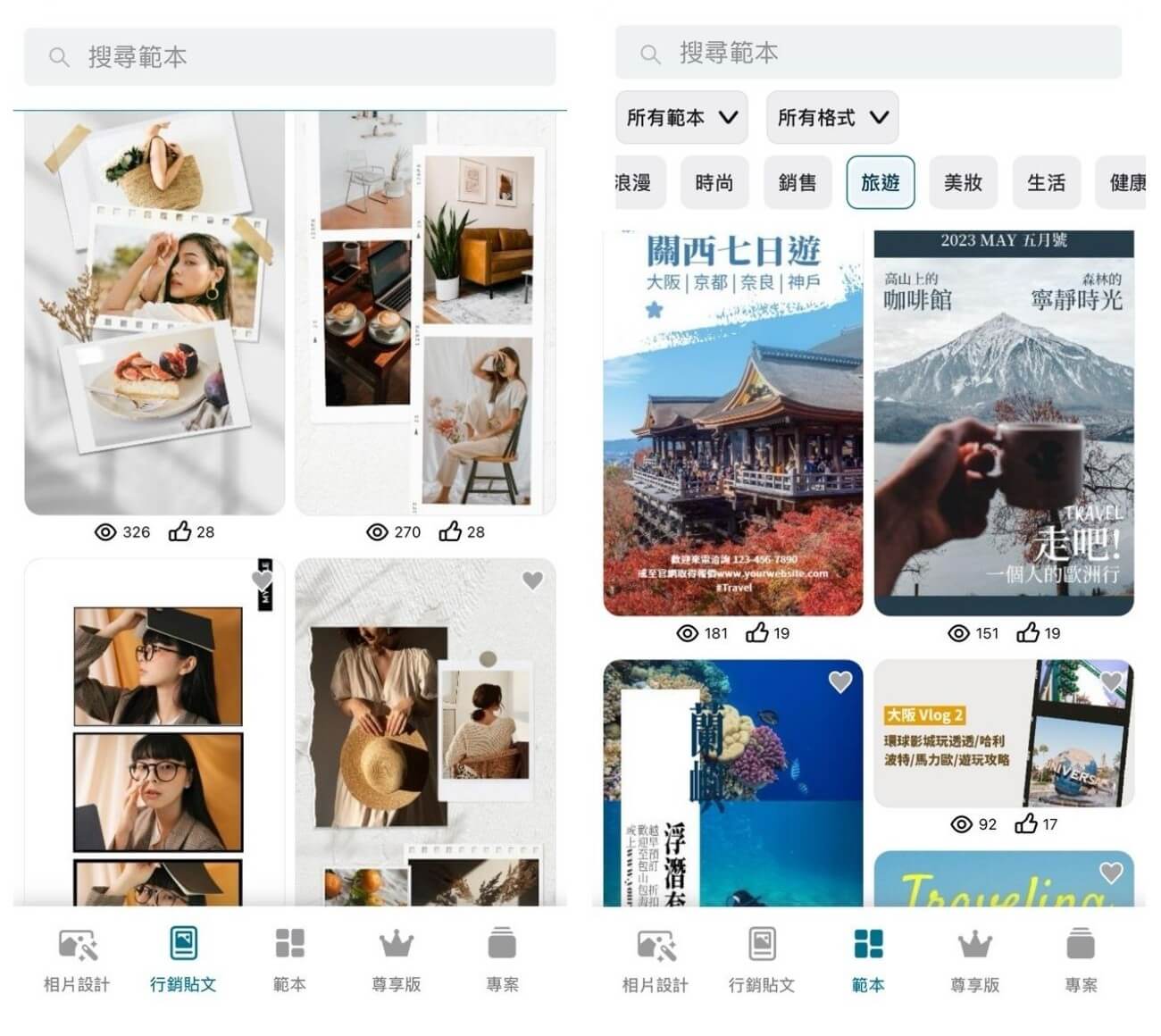 Promeo 內建許多好看的拼貼模板,換上自己的照片就能迅速打造精緻限動;也有許多 IG 限動或貼文的範本,直接套用或當作排版靈感都很適合!
