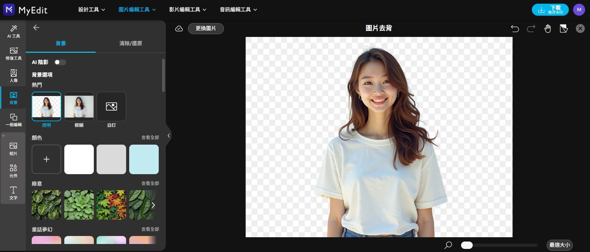想免費將照片去背或換背景的話,效果好又快的線上工具 MyEdit 絕對會是你的好選擇! MyEdit 的去背功能搭載強大 AI 技術,連髮絲等細節都能精準辨別,一鍵就能輕鬆獲得最乾淨的去背圖檔。