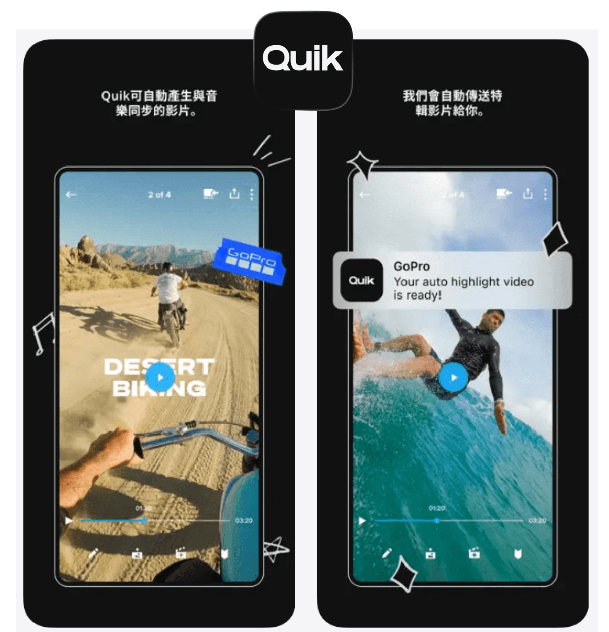 Quik 是 GoPro 官方推出的影片剪輯 App,以「極速自動剪輯」為核心特色,非常適合拍了大量運動或旅遊素材、卻不想花太多時間後製的用戶,上傳素材後,App 會自動分析並挑選精彩片段,並將轉場與剪切點對齊音樂節拍,輕鬆做出律動感十足的影片,騎車、衝浪、登山等各種動態活動的紀錄影片都非常適合用這款 App 完成。
